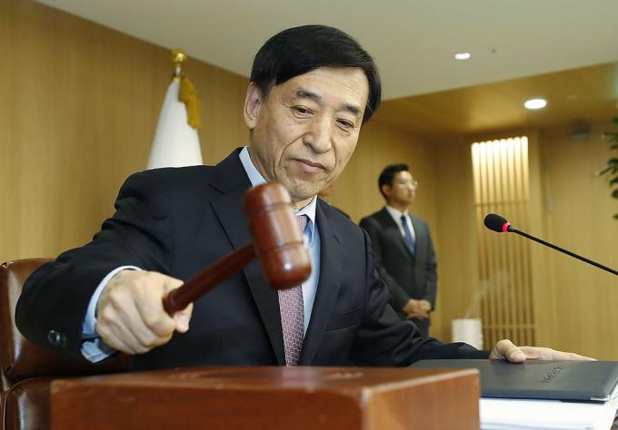 ▲ 이주열 한국은행 총재가 29일 오전 서울 중구 한국은행에서 열린 금융통화위원회에서 의사봉을 두드리며 개회를 선언하고 있다. [정병혁 기자]