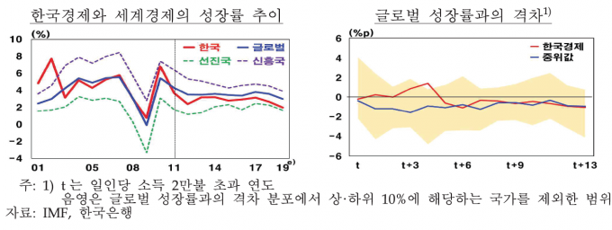 아울러 장기적으로 보면 우리 경제 성장률이 2011년 이후 세계 경제 성장률을 계속 밑돌고 있는데 그 격차는 경제 성숙도를 고려할 때 다른 선진국의 과거 사례와 대체로 부합하는 수준이라고 진단했다.