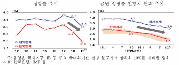 이날 한은은 올해 한국 경제가 2.0% 성장률을 기록할 것으로 전망했는데, 이는 작년 성장률 대비 0.7%포인트 하락한 것이다.