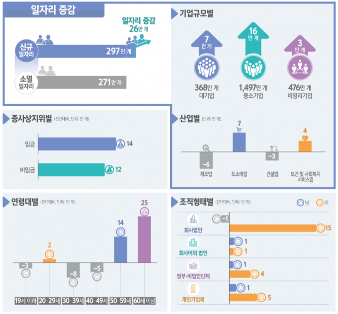 일자리 증가분(26만개) 중 대부분은 60세 이상의 몫이었다. 60세 이상이 점유한 일자리는 전년보다 25만개(8.3%) 증가했고, 50대와 20대도 각각 14만개(2.6%), 2만개(0.7%)씩 증가했다.