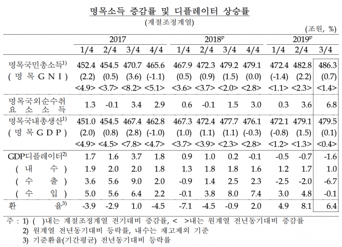 지난 3일 한국은행이 발표한 올해 1~3분기 국민총소득은 1441조4400억 원으로 지난해 같은 기간보다 1.56% 증가하는 데 그쳤다.