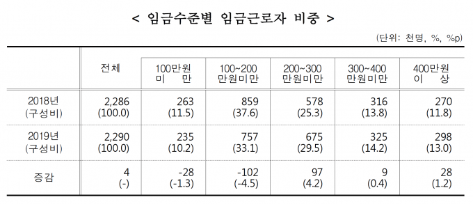 임금근로자를 임금수준별로 살펴보면 100만 원 미만 23만 5000명(10.2%) 100만~200만 원 미만 75만 7000명(33.1%)이었다. 200만~300만 원 미만 67만 5000명(29.5%), 300만~400만 원 미만 32만 5000명(14.2%), 400만 원 이상 29만 8000명(13.0%)이었다.