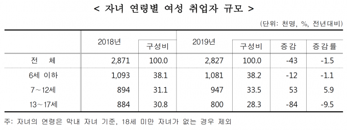 고용률은 자녀가 많을수록 낮아지는 경향을 보였다. 자녀 연령별 고용률을 살펴보면, 6세 이하 108만 1000명(38.2%)이 가장 많았고, 7~12세 94만 7000명(33.5%), 13~17세 80만 명 (28.3%) 등이 뒤를 이었다.
