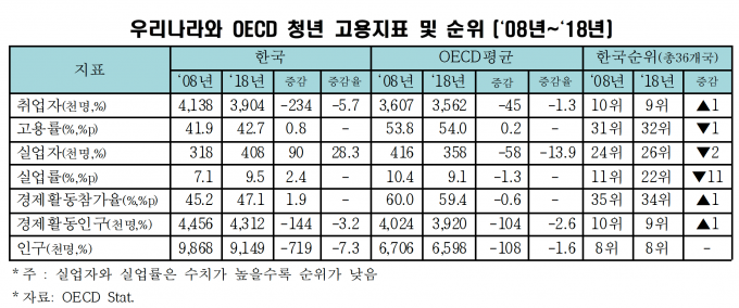 청년취업자는 2008년 413만8000명에서 2018년 390만4000명으로 10년간 5.7% 감소(-23만4000명)했지만, OECD 내 청년취업자 순위는 10위에서 9위로 한 단계 올라섰다.