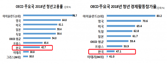 한국 청년고용률은 42.7%로 OECD 36개국 중 32위 기록 한국의 청년실업률이 글로벌 금융위기 때 보다 상승한 것으로 나타났다. 이는 같은 기간 실업률이 줄어든 경제협력개발기구(OECD) 주요국과 반대로 움직인 것이다.