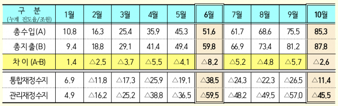통합재정수지에서 국민연금, 고용보험, 사회보장성기금 수지를 제외한 관리재정수지는 1~10월 누계 45조5000억 원 적자를 기록했다. 누계 기준 관리재정수지 적자 폭은 6월(59조5000억 원)에 정점을 찍고 7월(48조2000억 원)과 8월(49조5000억 원)에 감소했다. 9월(57조 원)에 다시 증가했다가 10월에 다시 낮아졌다.