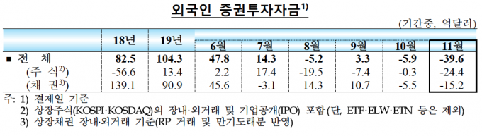 10일 한국은행이 발표한 '2019년 11월 이후 국제금융·외환시장 동향'에 따르면 지난달 외국인의 국내 증권투자자금은 주식 및 채권자금을 합해 총 39억6000만 달러(약 4조7000억 원) 순유출됐다.