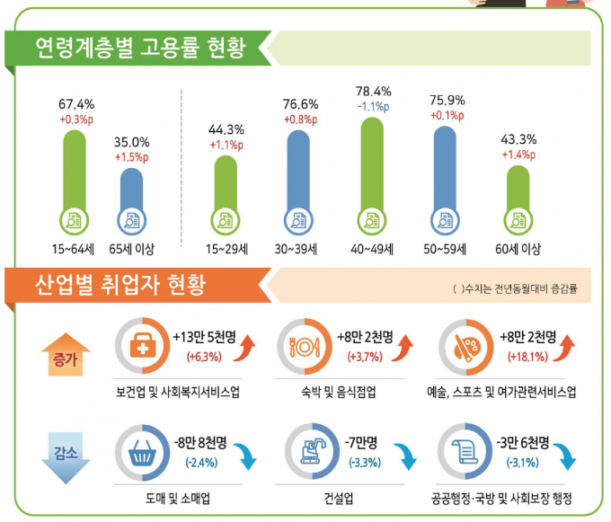산업별로는 보건업 및 사회복지서비스업(13만5000명), 숙박 및 음식점업(8만2000명), 예술·스포츠·여가 관련 서비스업(8만2000명) 등에서 증가했다.