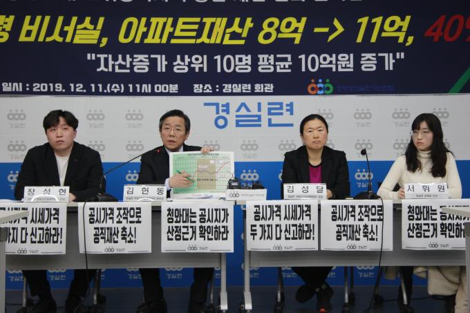 경제정의실천시민연합은 11일 오전 서울 종로구 경실련 강당에서 기자회견을 열고 "문재인 정부 출범 이후 대통령 비서실 소속 고위공직자들 65명의 아파트·오피스텔 재산 평균은 8억2000만 원(2017년 1월)에서 11억4000만 원(2019년 11월)으로 상승했다"고 밝혔다.