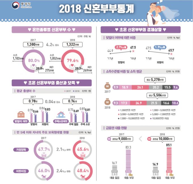 지난해 신혼부부의 평균 연간소득은 5504만 원으로 전년(5278만 원)보다 4.3% 증가했다. 맞벌이 부부 평균 소득은 7364만 원으로 외벌이 부부(4238만 원)보다 1.7배 많았다.