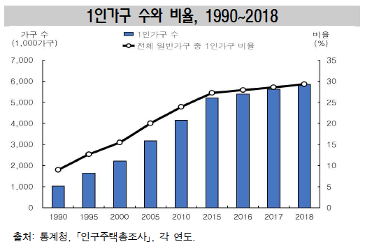 통계청이 13일 발표한 '한국의 사회동향 2019'에 따르면 1인 가구는 2018년 기준 585만 가구로 전체 가구의 29.3%로 집계됐다.