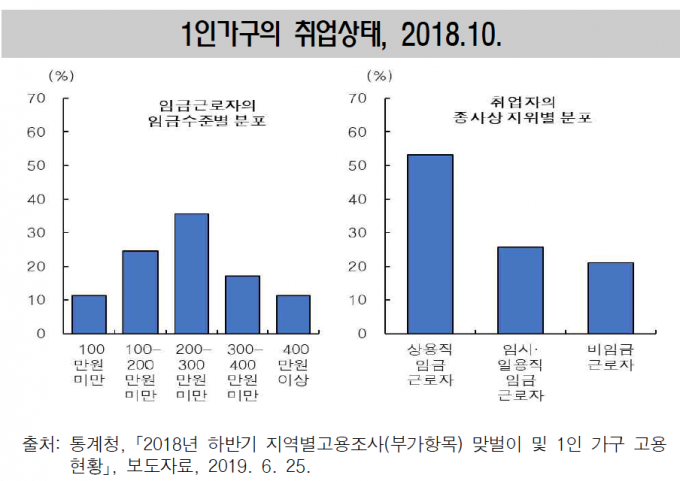종사상지위별로 살펴보면 1인 가구의 53.2%는 상용직 임금근로자였으며 25.8%는 임시·일용직근로자로 조사됐다. 비임금근로자는 21%였다.