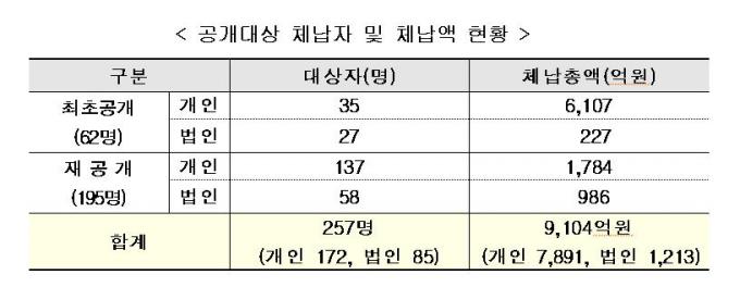 고액·상습체납자 257명 명단공개…총 체납액 9104억