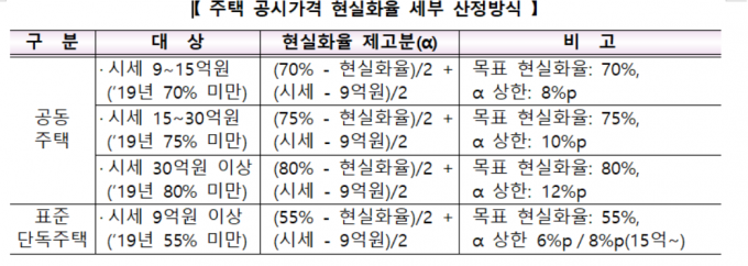 단독주택도 시세 9억원 이상 주택 중 현실화율이 55%에 미달할 경우 공시가를 올려 현실화율을 55%까지 맞출 예정이다. 공시가격 급등을 막기위한 현실화율 인상분 상한은 9억∼15억원 주택이 6%포인트, 15억원 이상이 8%포인트다.