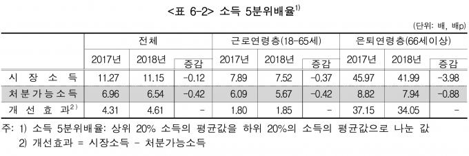상위 20% 소득의 평균값을 하위 20%의 소득의 평균값으로 나눈 값인 소득 5분위 배율은 균등화 처분가능소득을 기준으로 지난해 6.54배로 전년보다 0.42배 포인트(p) 감소했다.