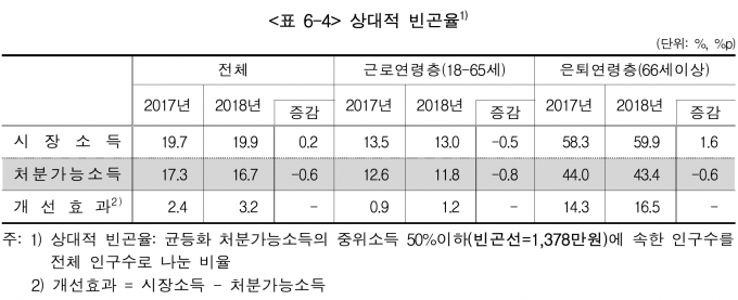 균등화 처분가능소득 기준 18~65세 근로연령층의 상대적 빈곤율은 11.8%로 전년대비 0.8%포인트 감소했다. 66세 이상 은퇴연령층의 상대적 빈곤율은 43.4%로 전년대비 0.6%포인트 감소했다.
