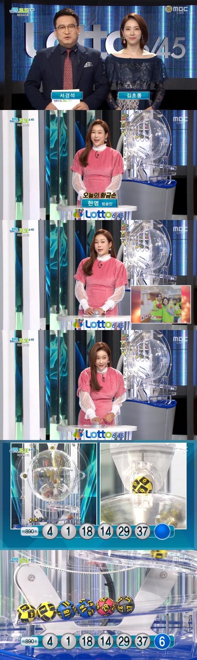 21일 방송된 MBC '생방송 행복드림 로또 6/45'에서는 제890회 로또복권 당첨번호 추첨이 진행됐다. 이날 방송에는 방송인 현영이 황금손으로 출연해 복권 추첨 버튼을 눌렀다.