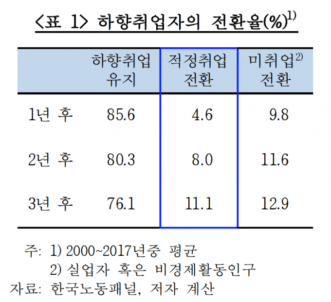 하향취업자의 85.6%는 1년 후에도 하향취업에서 벗어나지 못했다. 1년 후에 적정취업으로 전환하는 비율은 4.6%에 불과했다. 실업자가 되거나 비경제활동인구로 빠지는 경우도 9.8%였다. 2년과 3년 후 적정취업 전환율도 각각 8.0%, 11% 수준에 머물렀다.