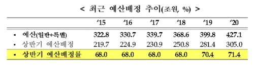 기획재정부는 24일 국무회의에서 '2020년도 예산배정계획'을 확정하고 내년 상반기 중 전체 세출예산의 71.4% 규모인 305조 원을 집행하기로 했다고 밝혔다. 이는 올해 상반기 예산 배정 비율(70.4%)보다 1%포인트 상승한 수치로 2013년(71.6%) 이후 가장 높은 수치다.