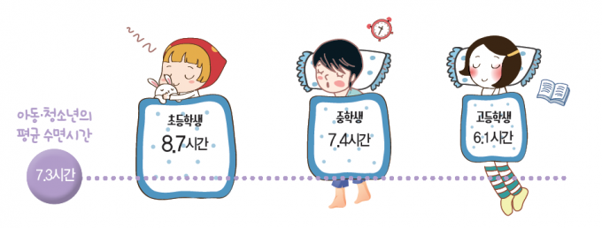 고등학생의 수면시간은 6.1시간, 중학생의 경우 7.4시간, 초등학교 4~6학년 학생은 8.7시간 취침하는 것으로 집계됐다.