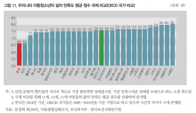 우리나라 아동·청소년의 삶의 만족도는 OECD 국가 중 가장 낮은 편에 속했다.