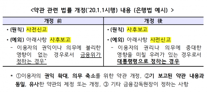 금융위는 소비자에 대한 금융서비스를 적시에 제공하고 금융회사의 상품개발 자율성 확대 등을 위해 금융사의 개별 약관 제정·개정 시 신고 절차를 현재 '원칙 사전신고/예외 사후보고'에서 '원칙 사후보고/예외 사전신고'로 전환했다고 설명했다.