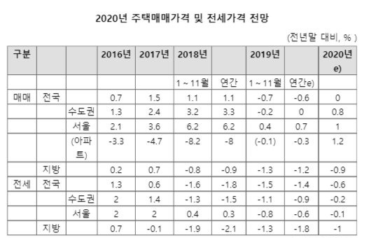 25일 주택산업연구원(주산연)의 '2020년 주택시장 전망'에 따르면 내년 서울의 아파트 값이 1.2% 상승할 것으로 내다봤다. 아파트를 포함한 서울의 내년 주택 매매 상승률은 1.0%로 예상했다.