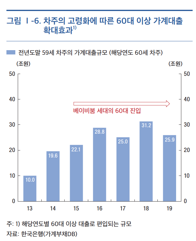 한은은 고령화의 영향으로 베이비붐 세대(55~63년생)의 고연령층 진입이 본격화되면서 60대에 신규 편입되는 차주의 대출규모가 확대된 것이 이 같은 증가세에 영향을 미쳤다고 분석했다.