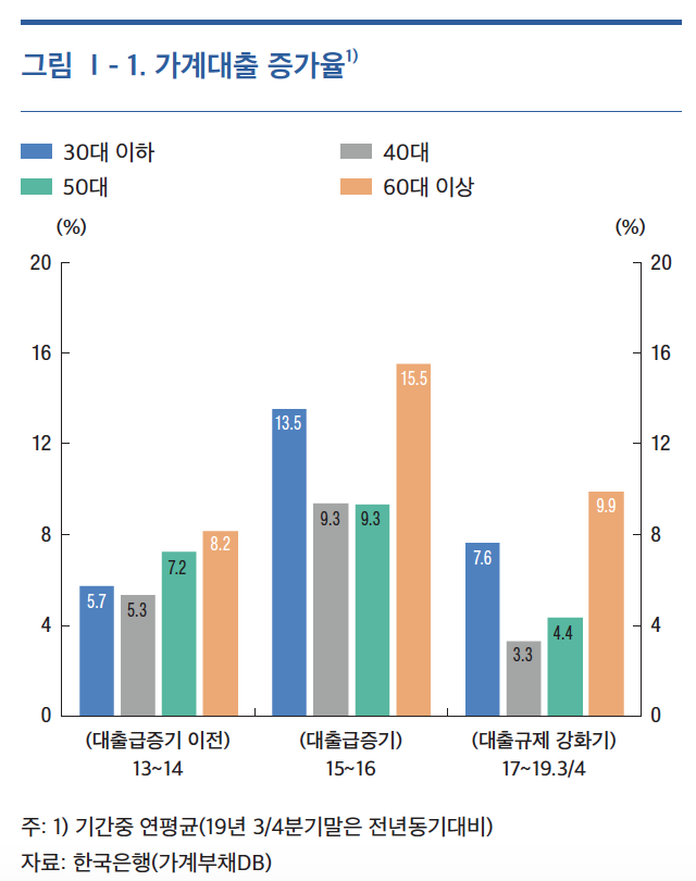 한국은행이 26일 발표한 금융안정보고서에 따르면 2017년 이후 대출 규제 강화 등으로 모든 연령층의 가계대출 증가세가 둔화했으나, 60대 이상은 9.9%의 비교적 높은 증가세를 지속했다.