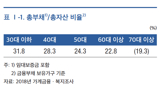 고연령층의 재무여력은 상대적으로 양호한 모습을 보였다. 60대 이상의 금융부채 보유가구의 총자산 대비 총부채 비율은 22.8%, 70대 이상은 19.3%를 나타냈다. 이는 30대 이하 31.8%, 40대 28.3%, 50대 24.3%에 비해 낮은 수준이다.