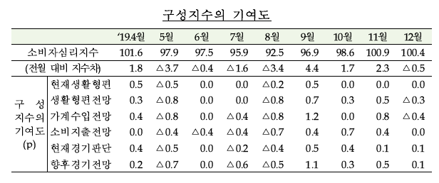 올해 8월 소비자심리지수는 2008년 금융위기 수준인 92.5까지 떨어졌다. 이후 증가세를 유지하면서 11월 100을 넘기며 낙관 전환했지만 12월 다시 소폭 감소한 것이다.