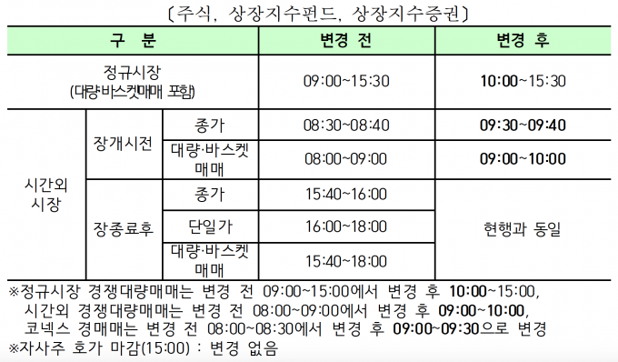 개장식에 따라 매매거래시간을 임시로 1시간 연기한 것이다. 종료시각은 현행과 동일하다.