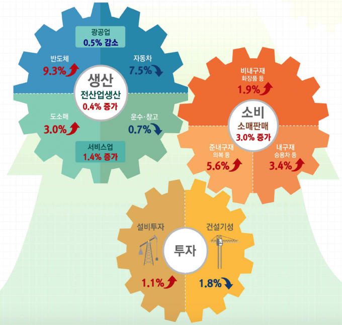 광공업 생산은 반도체(9.3%) 등에서 증가했으나 자동차(-7.5%), 금속가공(-6.5%) 등의 부진으로 전월 대비 0.5% 감소했다. 반도체 생산이 크게 증가한 것은 서버용 D램 등 고성능 반도체의 수요 증가에 따른 것이다.