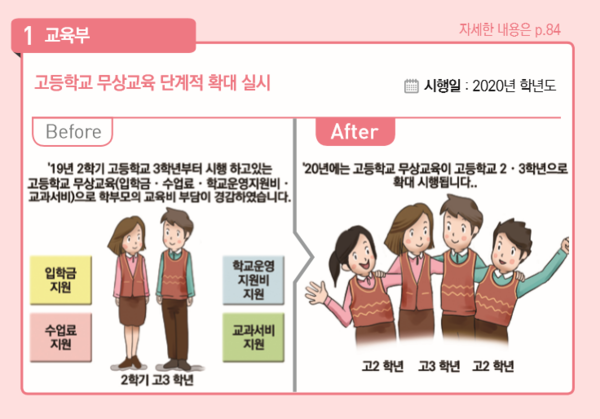 또 올해 2학기 3학년부터 시행된 고교 무상교육은 내년에 2학년까지로 확대된다. 입학금과 수업료, 학교운영지원비, 교과서비 등 1인당 연간 약 158만 원의 학비 부담이 경감된다.