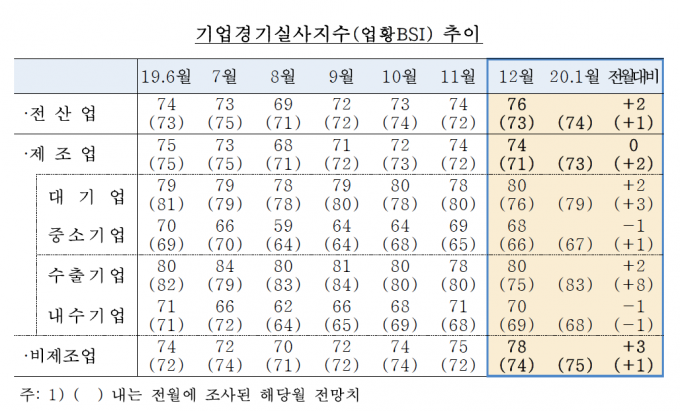 내년 1월 전 산업 업황 전망 BSI는 74로 이번 달보다 1포인트 올랐다.