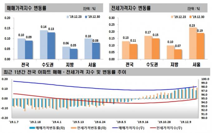 2일 한국감정원에 따르면 서울 아파트값(12월 30일 기준)은 1주일새 0.08% 올랐다. 오름세는 지속됐지만 상승폭은 전주(0.10%)보다 0.02%포인트 축소됐다.