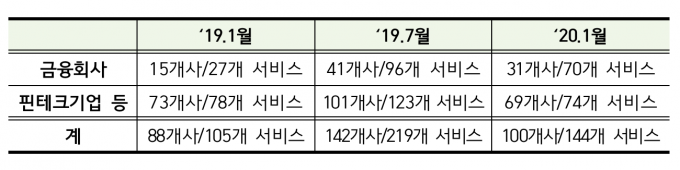 회사별로는 금융회사 31개사에서 70개 서비스가 접수됐고, 핀테크기업 등 69개사에서 74개 서비스가 접수됐다.