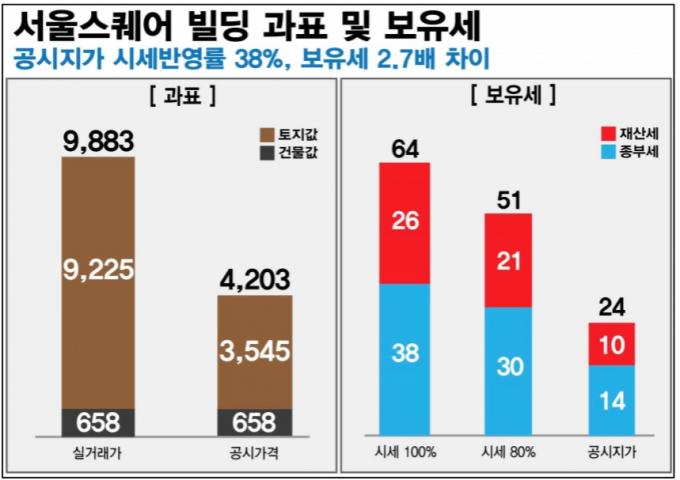 NH투자증권 여의도사옥(26.4%), 한진중공업 용산사옥(31.7%), 삼성 SDS타워(33.6%), 서울스퀘어(38.4%) 등도 공시지가 시세 반영률이 낮기는 마찬가지였다.