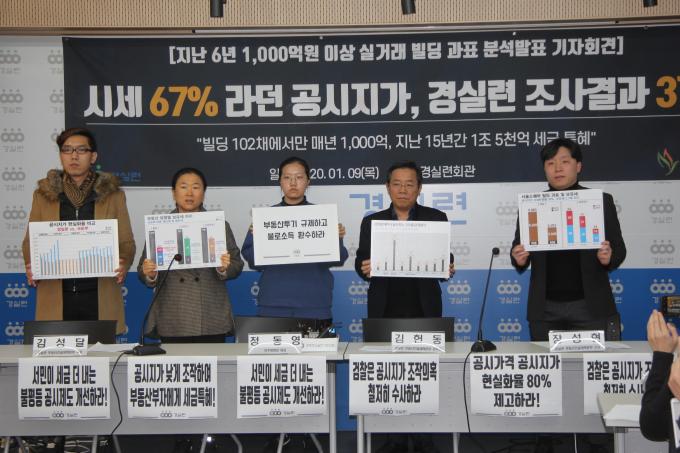9일 경제정의실천시민연합은 서울 종로구 경실련 회관에서 2014년부터 2019년까지 서울에서 거래된 1000억 원 이상 빌딩의 과표와 세액을 조사한 결과를 발표했다.