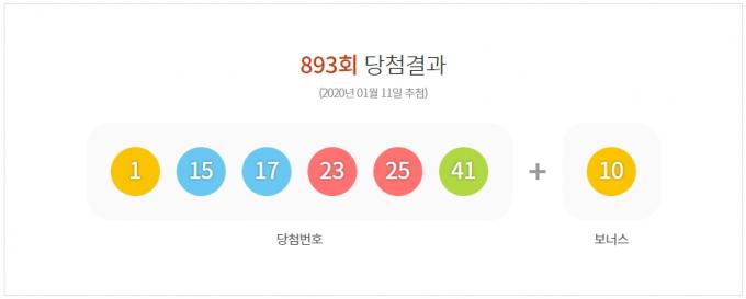 로또 수탁업체 동행복권은 지난 11일 복권통합포털을 통해 제893회 로또복권 당첨번호를 공개했다. 이날 발표된 1등 당첨번호는 1, 15, 17, 23, 25, 41이며 2등 보너스번호는 10이다.