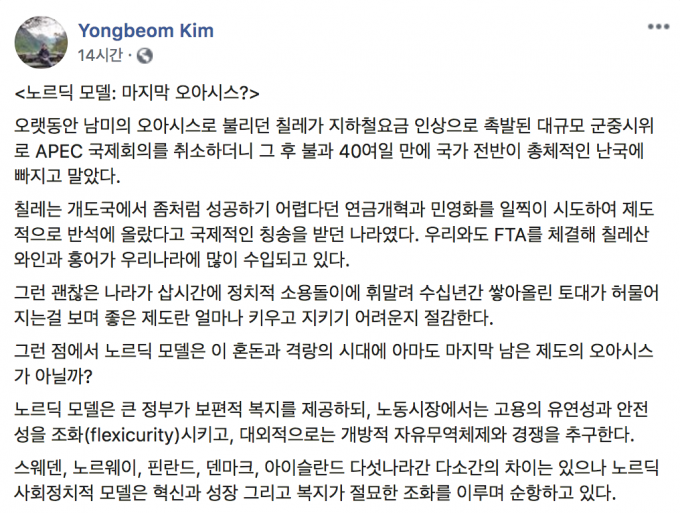김용범 차관은 12일 자신의 페이스북을 통해 "노르딕 모델은 우리가 어려운 난제를 앞에 두고 해법을 모색할 때 찾아갈 오아시스로서 손색이 없다"고 밝혔다.