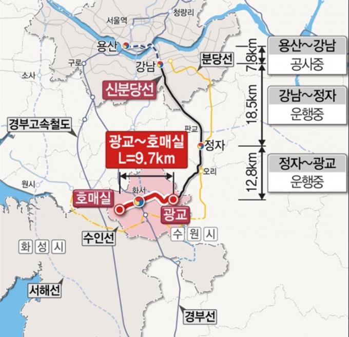 신분당선 광교∼호매실 구간은 서울 강남에서 경기 광교신도시까지 이어진 신분당선을 연장해 9.7㎞ 구간에 정거장 4곳을 만드는 사업으로, 총사업비는 8881억 원이다.
