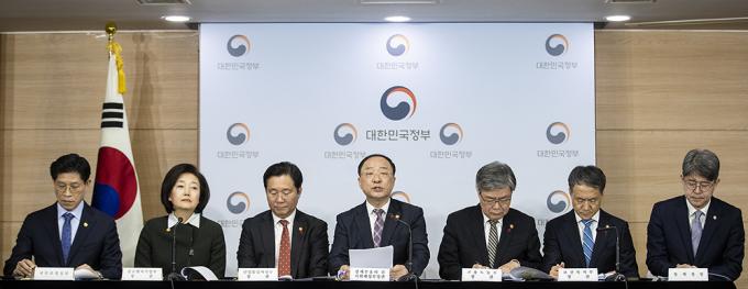 ▲ 홍남기 경제부총리 겸 기획재정부 장관이 15일 오전 서울 종로구 정부서울청사에서 2019년 고용동향 및 향후 정책방향을 발표하고 있다. 왼쪽부터 노형욱 국무조정실장, 박영선 중소벤처기업부 장관, 성윤모 산업통상자원부 장관, 홍 부총리, 이재갑 고용노동부 장관, 박능후 보건복지부 장관, 강신욱 통계청장. [정병혁 기자]
