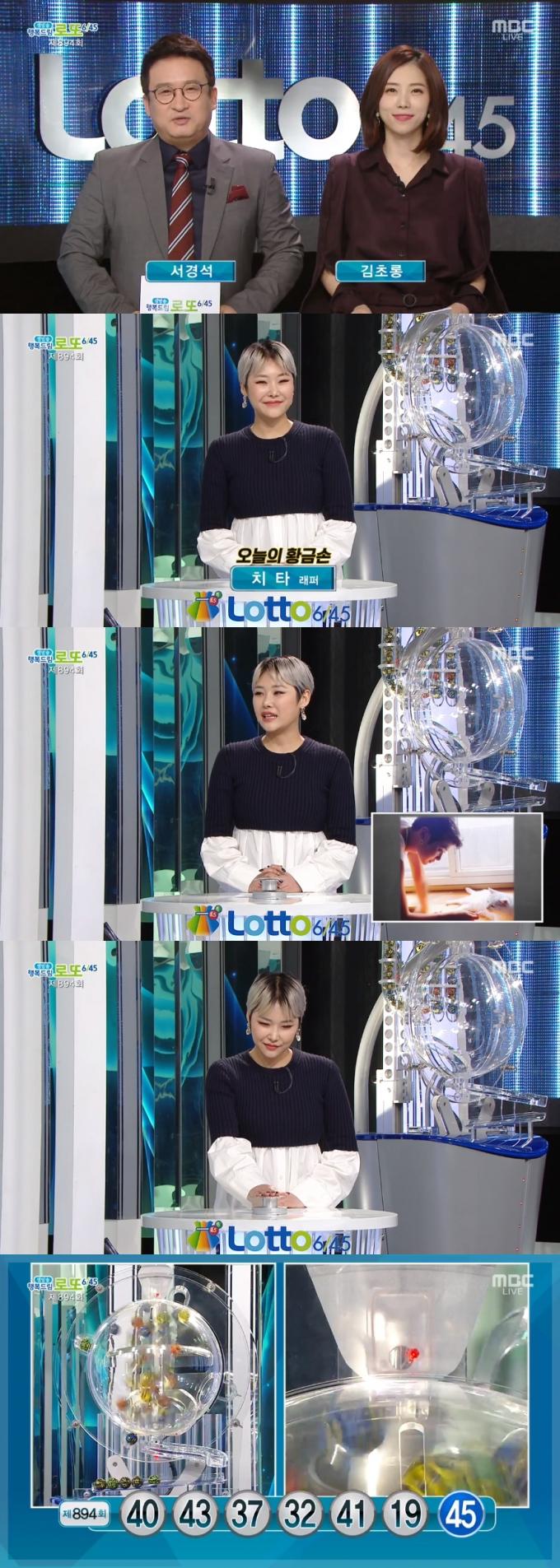 18일 방송된 MBC '생방송 행복드림 로또 6/45'에서는 제894회 로또복권 당첨번호 추첨이 진행됐다. 이날 방송에는 래퍼 치타가 황금손으로 출연해 복권 추첨 버튼을 눌렀다.