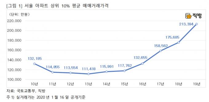 20일 직방이 서울 아파트 매매 실거래가(16일까지 집계)를 분석한 결과, 지난해 아파트 매매 거래가격 상위 10%의 평균가격은 21억3394만 원으로 조사됐다.