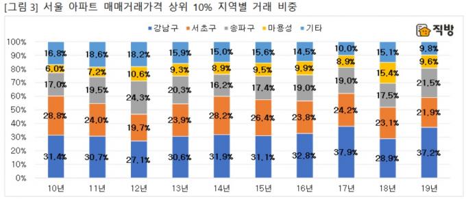 지역별 거래비중은 지난해 강남3구가 80.60%를 차지하면서 다시 확대됐다. 신흥 고가아파트가 확대되던 마용성(마포·용산·성동구)은 2018년 15.4%에서 2019년 9.6%로 줄어들었다.