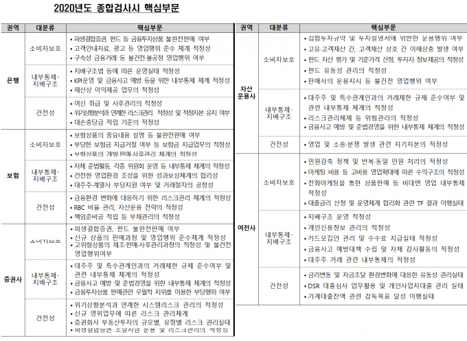 ▲ 2020년도 업권별 종합검사 핵심부문. [금융감독원 제공]