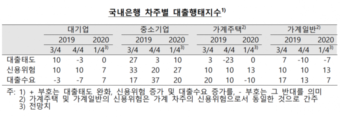 중소기업의 대출수요는 늘어날(20) 것으로 예상된다. 중소기업의 경우 운전자금 수요가 이어지는 가운데 은행들이 대출취급기준을 완화한 영향을 받았다.