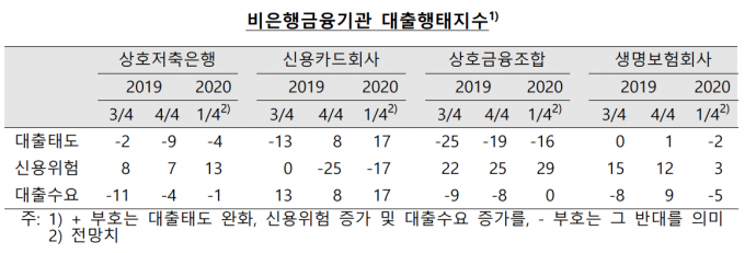 비은행권에서는 상호금융조합은 주택시장 안정화 방안에 따른 주택 대출 규제와 여신건전성 관리 강화 등으로 대출태도를 강화(-16)할 것으로 예상됐다.