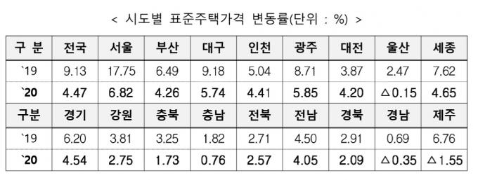 반면 제주(-1.55%), 경남(-0.35%), 울산(-0.15%) 등 3개 시·도는 전년 대비 공시가격이 하락한 것으로 조사됐다.